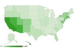 The United States is the second largest energy consumer in the world, which underscores the importance of diversifying the energy mix.23 The U.S. has a residential adoption rate of 3.4% and homeowners can take advantage of a variety of state and local incentives, as well as a federal investment tax credit of 30% for installation costs.24 Below you will see the country broken down into some of the top and bottom states.25
