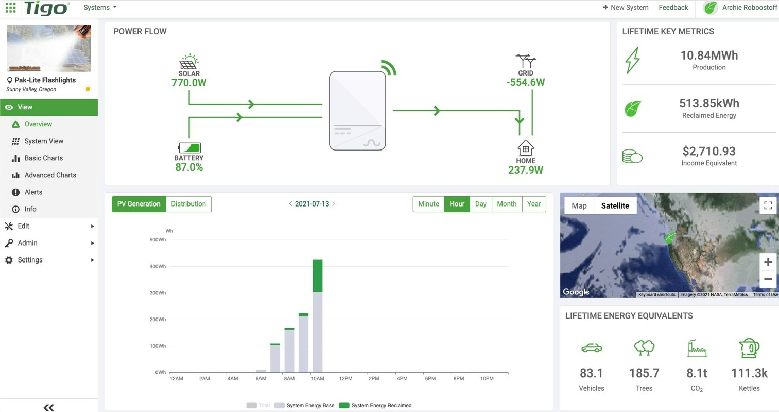 Then we get into the system view. So, this is the view that you and your customers can see. In the top panel (see Figure 5), you see what's coming in off the modules, coming into an inverter, if they've connected a battery, if they've connected a home energy meter, or anything else. You can see real time flow.