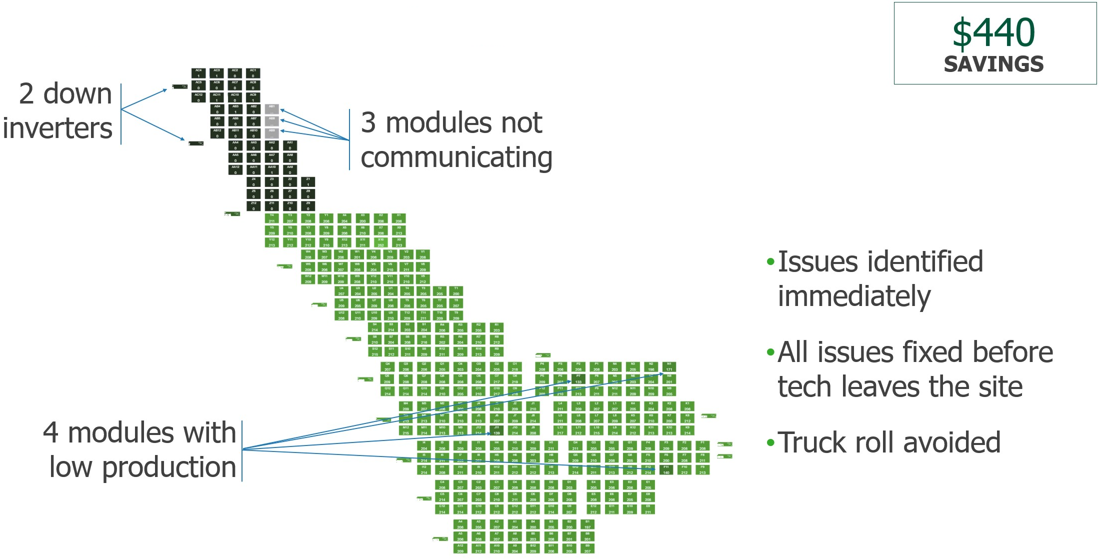 - Minimizing O&M costs. That's all about reducing those truck rolls. So, by identifying module level issues, you can pinpoint the issues remotely.