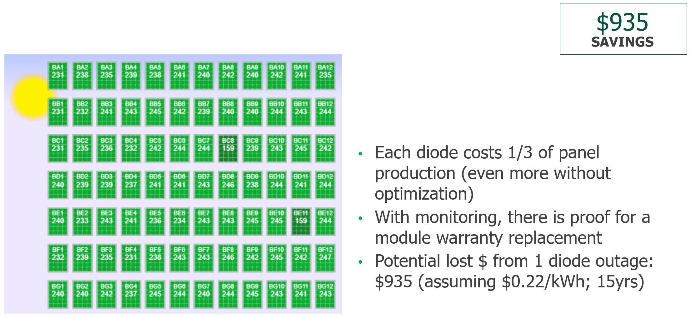 Let's use a common example. There's a diode out. Typical diode outage reduces the output of about one third of the panel and likely it’s even more without optimization. But for being conservative, let's assume one third of that panel or module is not producing energy. If you don't have module-level monitoring, that might go completely unnoticed for 15 even 25 years – it might just be a slight reduction in output that no one really realizes. With monitoring the second that system is commissioned and brought live, you're going to get a view like what you're seeing in Figure 11. You can see super clearly there are two modules in here (the darker green ones) where the production is lower than you would expect for brand new array or brand-new modules. And to quantify it, I know there's two in this picture, but just one diode outage – and not even over the whole 25 years, just assume over 15 years at $0.22 a kilowatt hour (about a residential rate) – that’s $935. If it's over the full 25 years, you're looking at $1,500 or so dollars. That's a significant amount of money that really adds up over time.