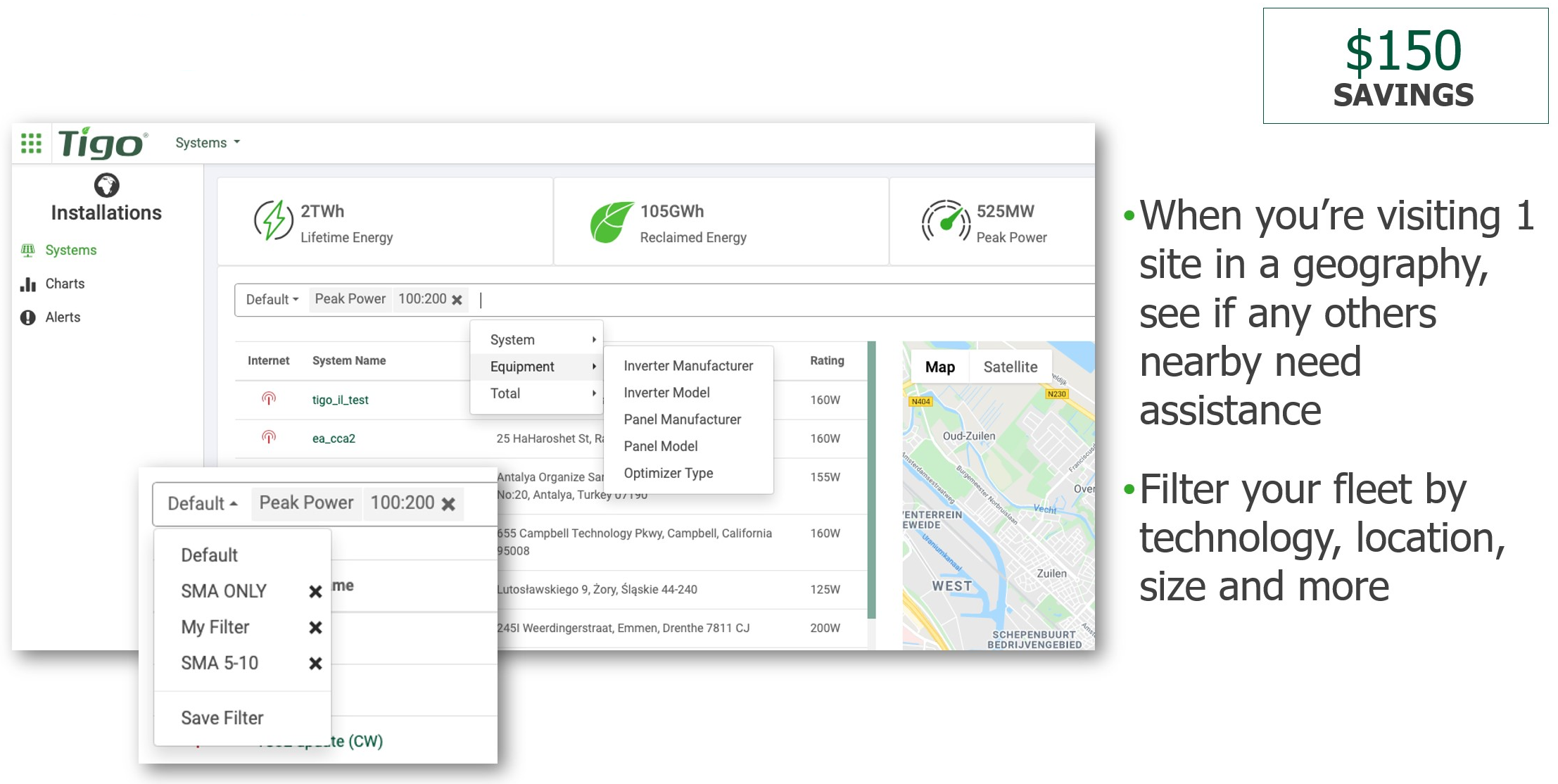 You're also able to filter by any number of metrics that are included in the system, including the size the technology used, et cetera. So, you have all of your systems in one central database. Very cool for your own operational needs and also very cool from a marketing standpoint, because we have this really cool kiosk mode that'll flip through your different installations. So that's the top-level, fleet-wide view.