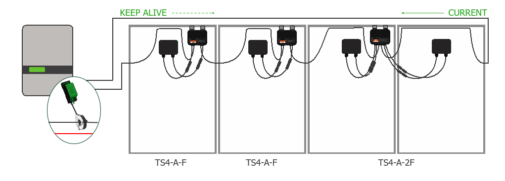 So, you're only going to use one of the polarities, either put all the positives or all the negatives through it and the transmitter induces this “keep alive” signal on to that conductor for powerline communication. As long as the TS4-F and -2F devices see this “keep alive” signal, then they allow array, voltage, and current to pass through them.
