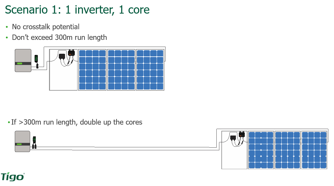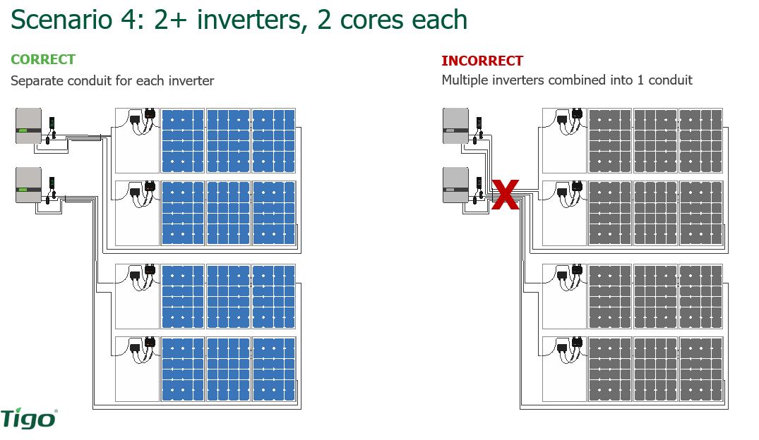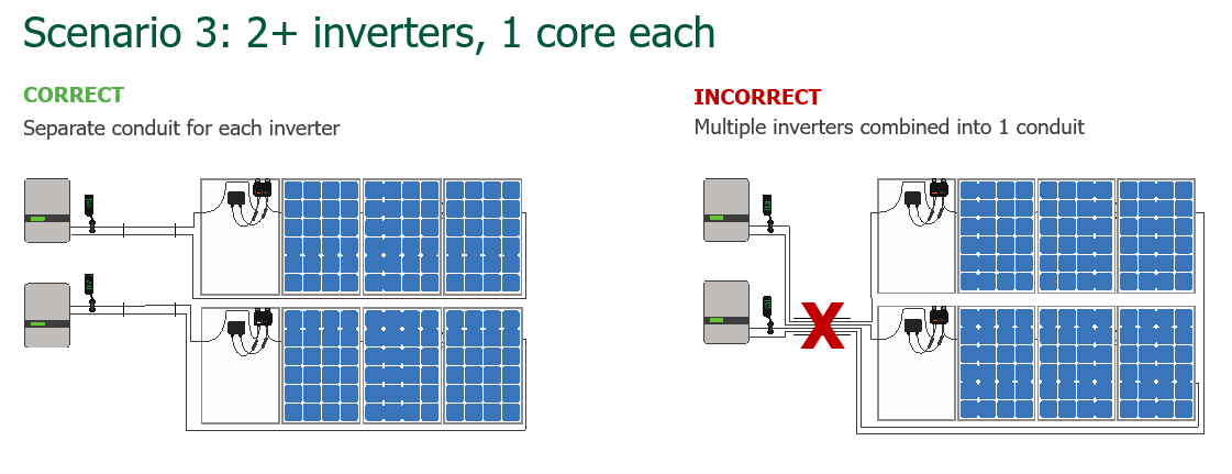 Scenario 3: Two inverters with one core. So here we're showing you what to do and then what not to do. So, if you have two inverters with one core, then you need to split those conduits. Do not run those two inverters, those strings from those two inverters, in the same conduit because now you have two different inverters, two different RSS transmitters, and that can interfere with each other. So, we show the right way to do it (left), and this is what we've seen people do that will cause an issue later on (right).