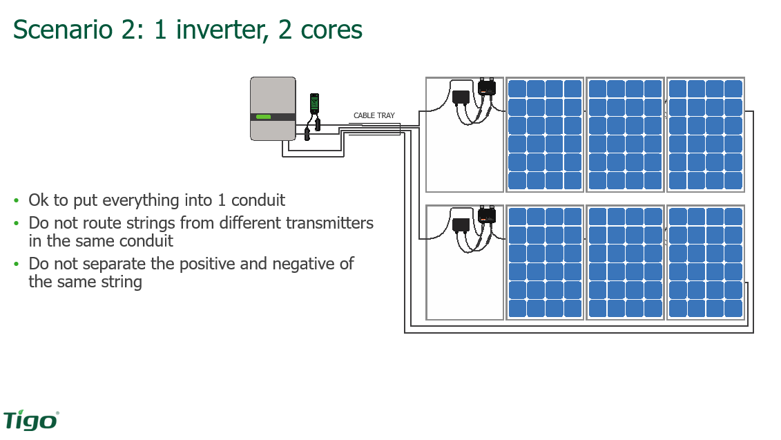 Scenario 2: One inverter with two cores. What we see here is that it is okay to put all those surrogates in the same cable tray, in the same conduit. But we do not want to route strings from different transmitters in the same conduit though because you have two different signals going through there and they could affect each other. Also, do not separate the positive and negative of that string. So, you either have all the positives going through or you have all the negatives go through the core. Pick one, but don't mix and match.