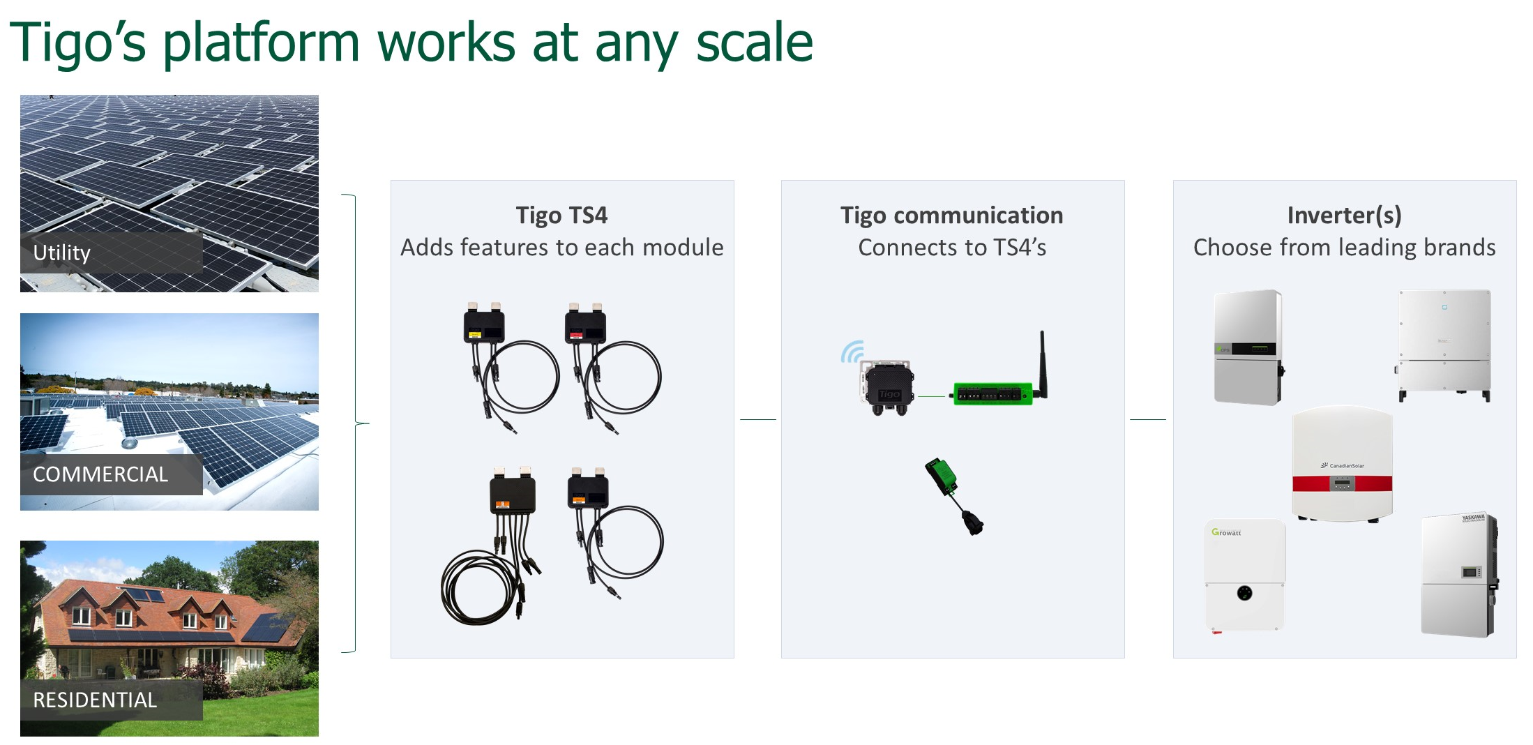 Tigo’s TS4 product line. It scales from any system to the very small, to the very large. You can add the features that you want to each module. There are some versions of Tigo that can actually be mixed, not all, but some of them can be mixed.