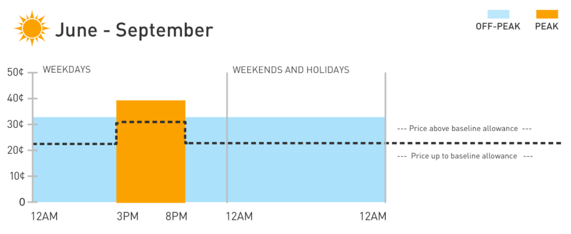 Time of use plans are based on how much energy you use and when you use it. Most plans have selected hours that have higher ‘peak’ rates for specific hours in a day. For example, PG&E, located in California, has peak rates set from 3-8pm on weekdays (see Figure 2). Sometimes these peak periods coincide directly with solar energy production, in which case solar is generating you even more savings during these times. In other instances, technologies that shift energy load – such as batteries – can help capture additional savings during this period.