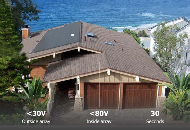 Furthermore, all panels are connected serially – one to the other – to generate anywhere between 500 volts to 600 volts on the roof. And again, the requirements are that you will have less than 80 volts inside the array boundary and less than 30 volts outside the array boundary in less than 30 seconds. So even if you put two panels together, you still need to have a module-level shutdown. And the rapid shutdown requirement is spreading all over the world and is now being adopted in other locations.