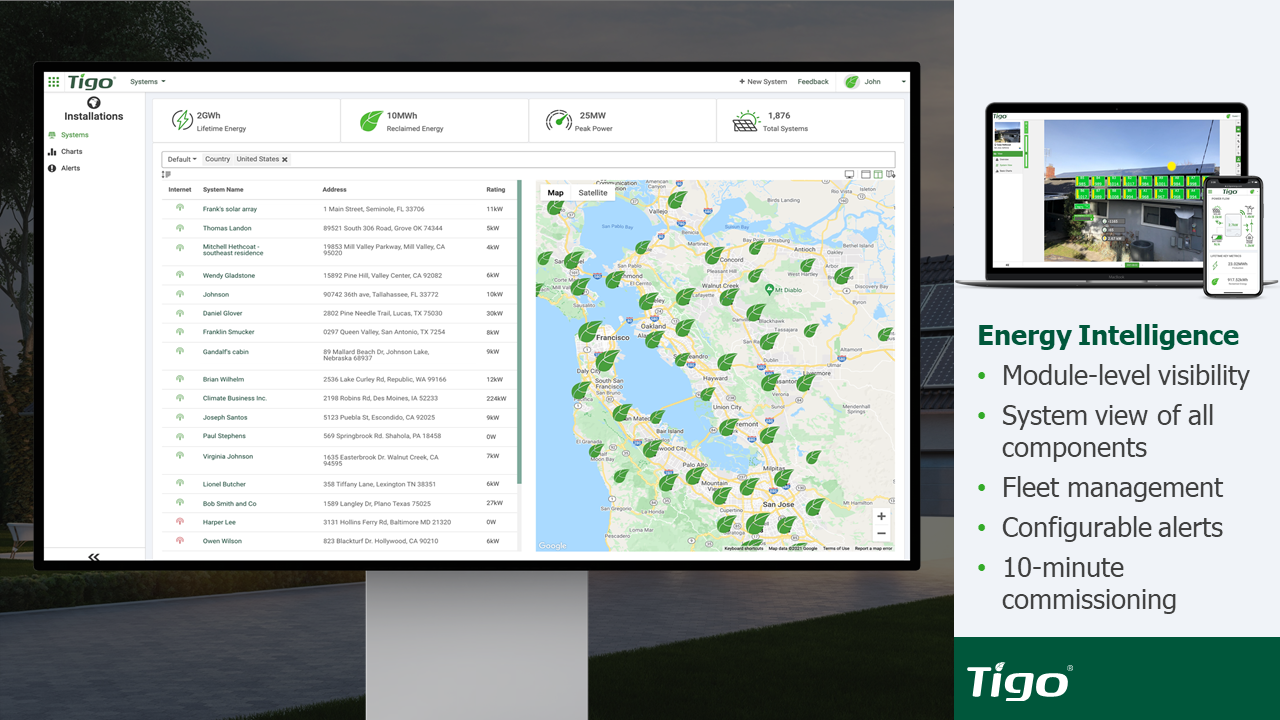 Tigo has you covered from ATS to TS4. One supplier, one solution. All brought together by Energy Intelligence. Energy Intelligence provides fleet management, system commissioning, and monitoring when use with the TS4-A-O module level monitoring for the most granular data in the industry. Tigo and Energy Intelligence maximizes the system uptime through real time alerts. Real data, in real time helps minimize O&M costs. Know before you go, EI allows you to be on top of your fleet performance. This makes customers happy, happy customers drives more business.