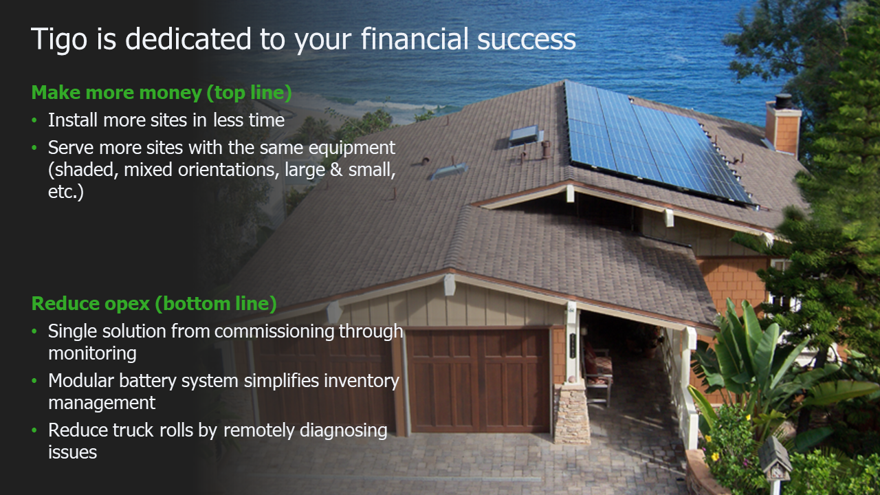 Tigo is your partner and with your success, comes our success. Top line, we want to help you make more money. The flexibility of the Tigo Energy Intelligence Residential Solution makes it easy to use in any grid tied application and the simplicity of the products allow the installation to be done in less time. Bottom line, we can help you reduce your OpEx. One software platform performs all the work from commissioning through O&M. The modularity makes inventory management simple and Tigo doesn't stop after install. The O&M functionality lets you know before you go. Never roll a truck again without knowing what tools, equipment, and personnel are right for the job. Energy Intelligence helps you achieve all of this.