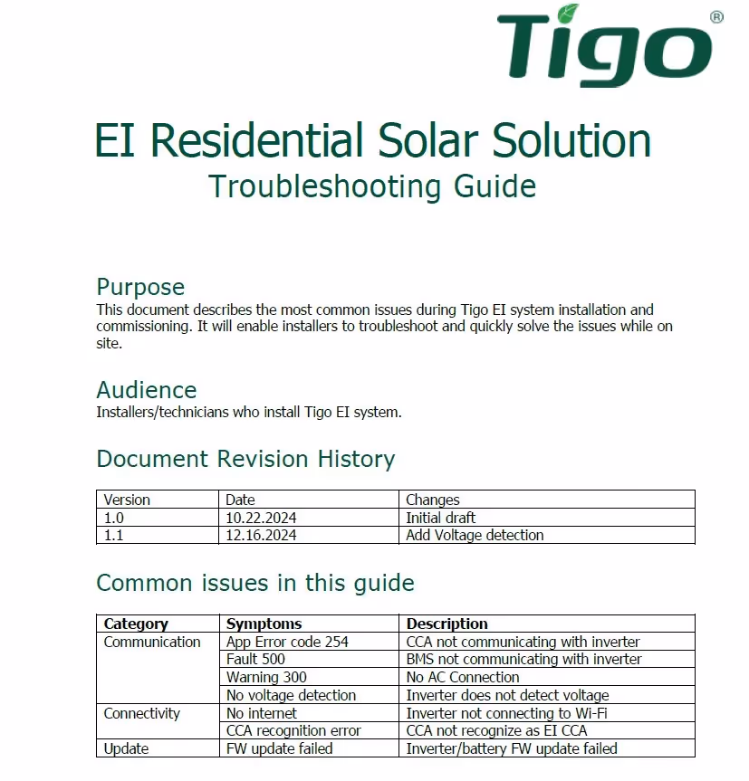 This document describes the most common issues during Tigo EI system installation and commissioning. It will enable installers to troubleshoot and quickly solve the issues while on site.