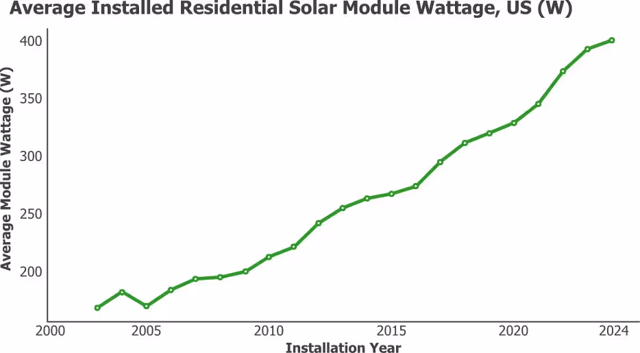 Solar modules are getting more powerful. Figure 2 shows the average wattage of a residential module installed in the United States. In 2015, the average module was 267W. In 2024, the average hit 400W, a nearly 50% increase (Lawrence Berkeley Lab, 2024).