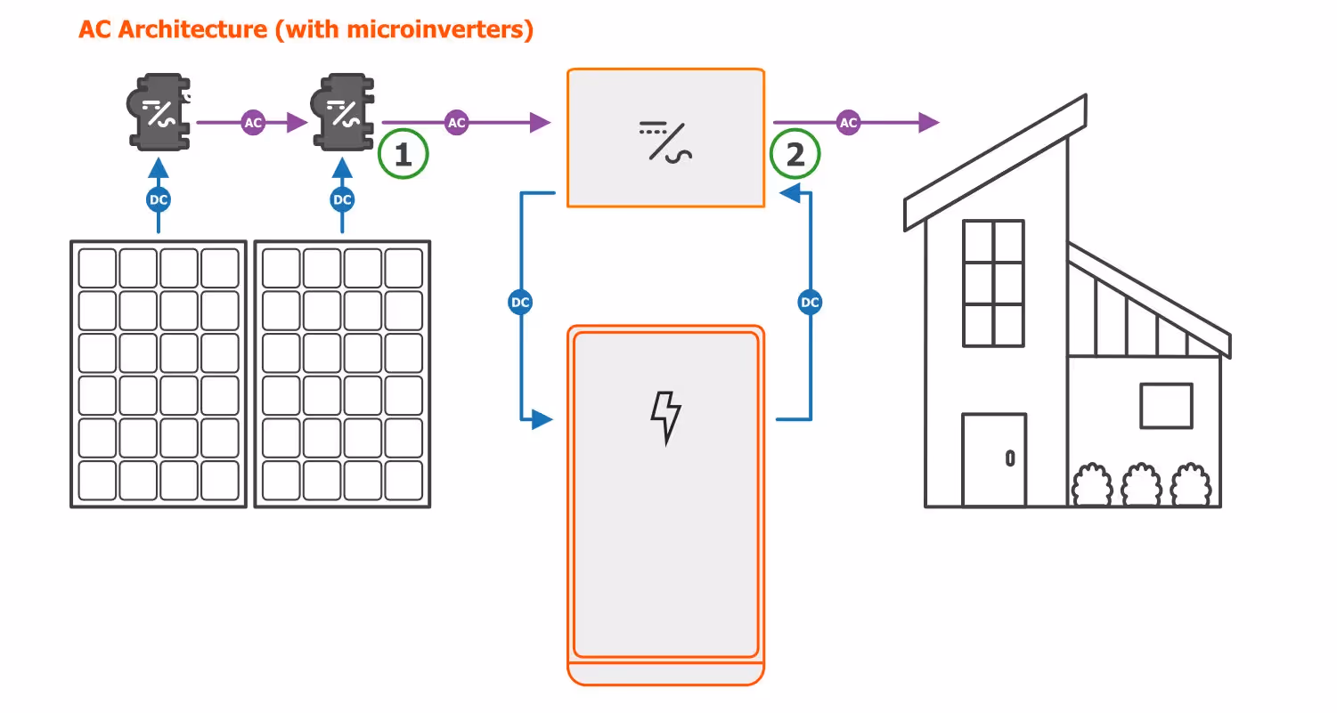 - More hardware is required. AC architecture requires inverters for solar and a separate inverter for the battery. Compared to DC architecture where one battery serves both.