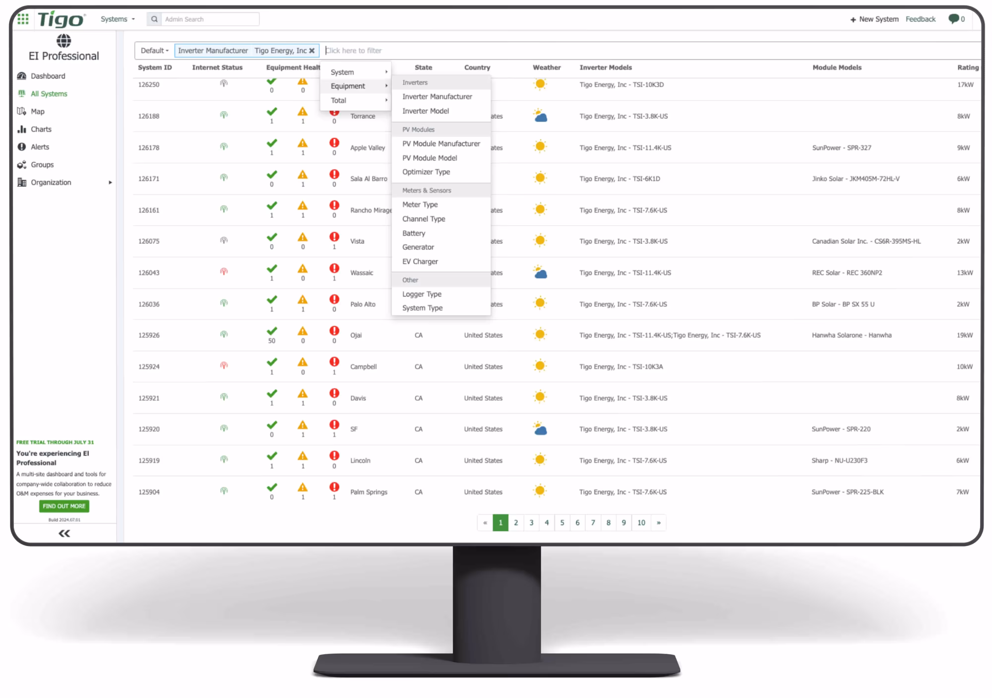 Tigo EI Professional is a web application for solar professionals overseeing multiple installations, enabling tracking, commissioning, monitoring, control of their solar operations, as well as messaging and initiating direct support tickets and RMA to Tigo.